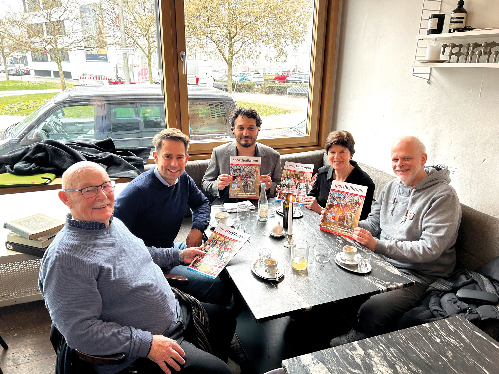 Von links: Herbert Tabler, Christoph Troßbach, Altin Zhegrova, Karin Schüttler und Ralf Scherlinzky mit den ersten SPORTHEILBRONN-Ausgaben von 2016. Foto: SPORTHEILBRONN